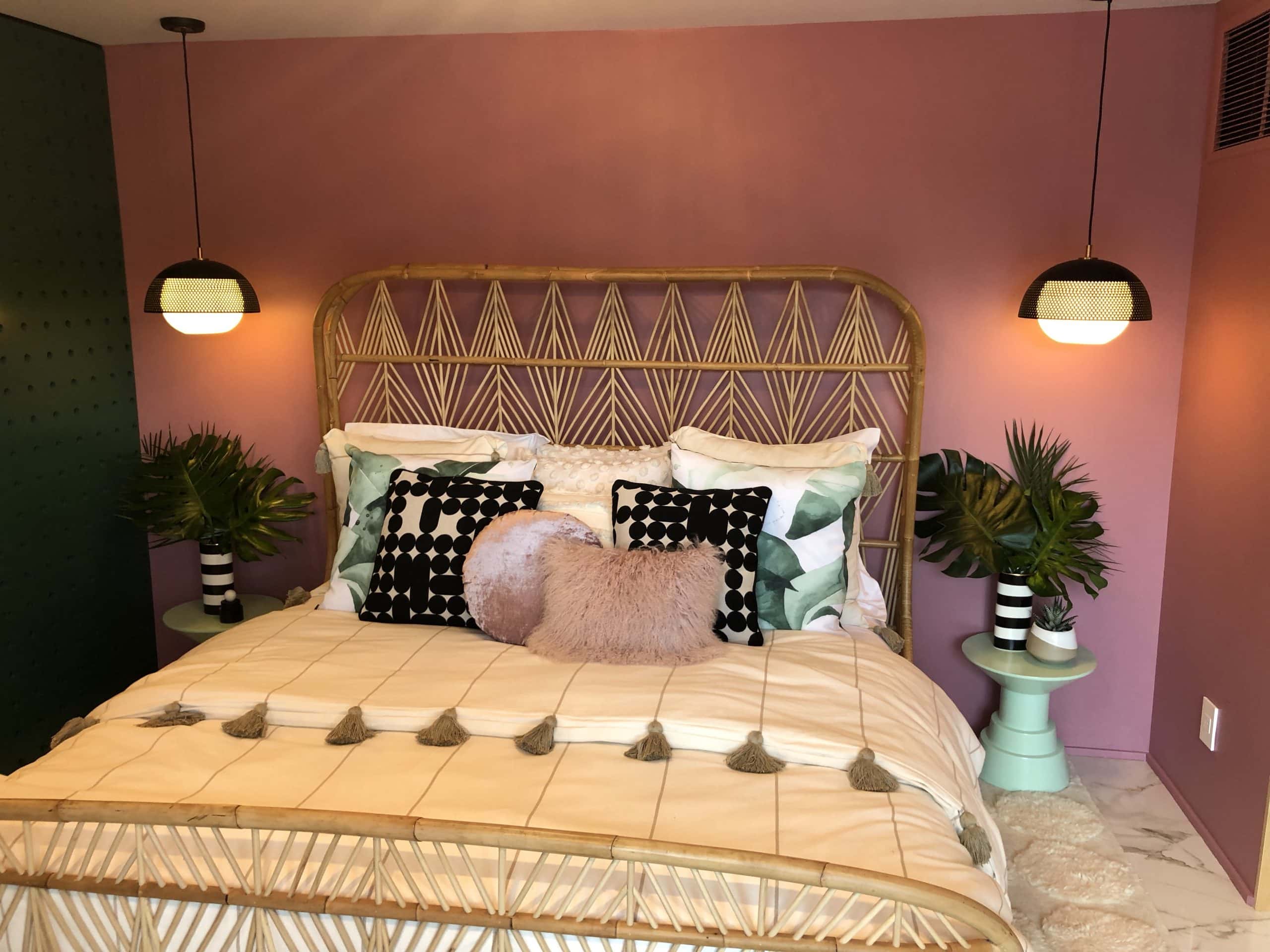 Located in the posh Indian Canyons neighborhood of Palm Springs and set on a sweeping golf course, this spectacular 1962 property is 3600 square feet and features three bedrooms and three bathrooms plus an attached guest house. A down to the studs refurbishment, led by Kennedy and his team, respected the modernist property’s architectural pedigree while updating it with the best and brightest materials in modern design. Gorgeous and creative colors, textiles, materials, and staging created a jewel box of a home—and yet, it was still entirely livable, practical and accessible.